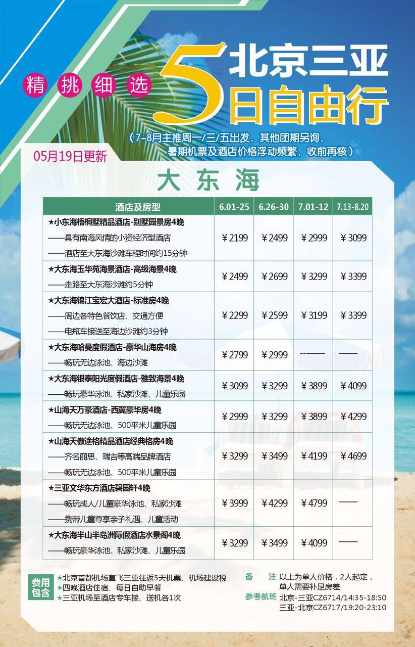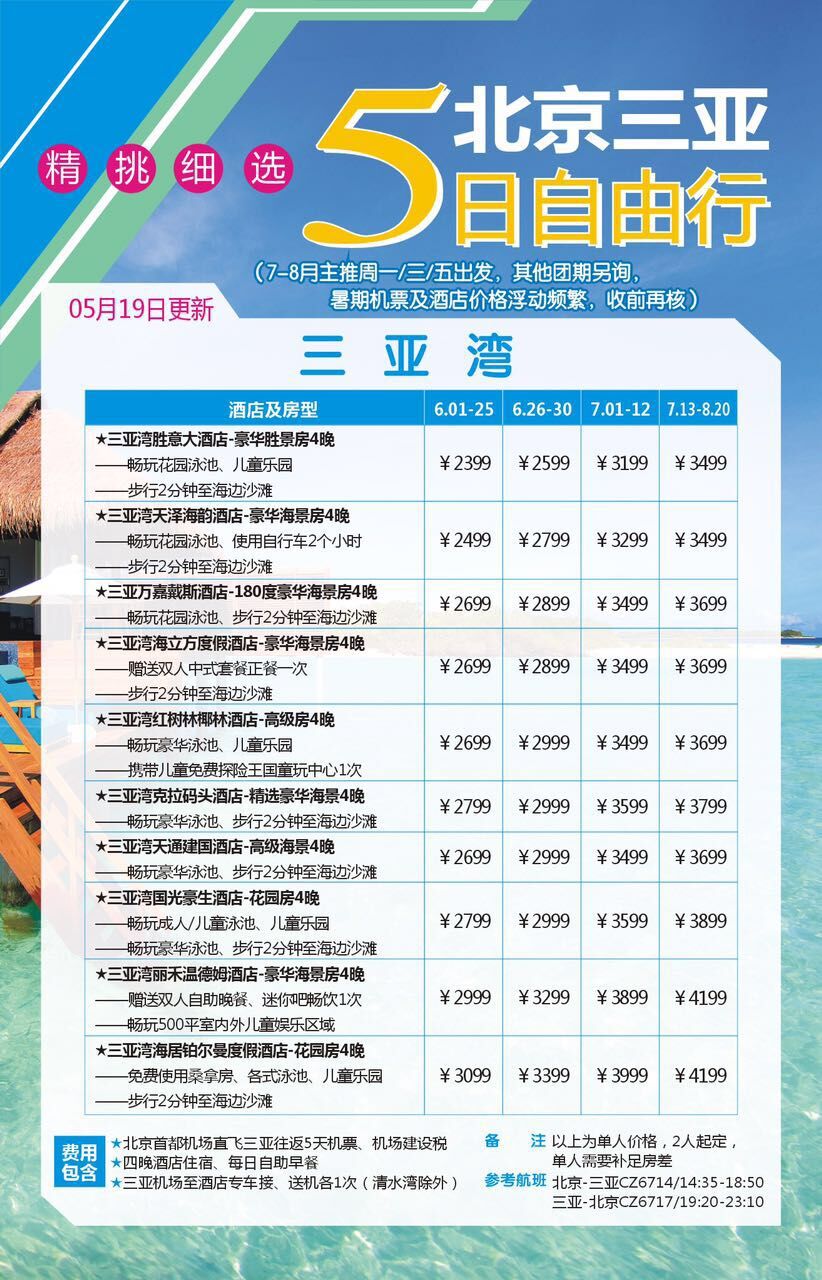 三亞自由行=北京--三亞--北京5天往返機(jī)票+入住4晚三亞酒店+三亞機(jī)場(chǎng)--酒店免費(fèi)接送機(jī)場(chǎng)