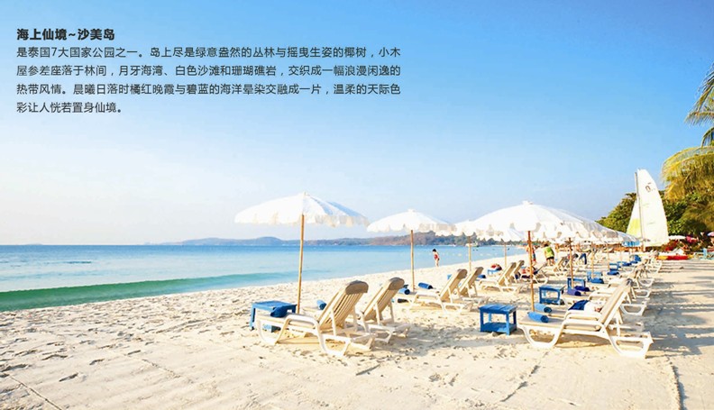 【沙美島國(guó)家海洋自然保護(hù)風(fēng)景區(qū)】這里就像世外桃源,放眼望去是滿島的椰樹、棕櫚,似乎進(jìn)入了熱帶叢林,還有美得令人窒息的細(xì)膩雪白的沙灘和清澈碧綠的海水。整個(gè)海島以藍(lán)天白云為背景、銀沙碧海作襯底的美麗海濱,近處可清澈到底,遠(yuǎn)眺海天一色,真的不需要太多的旅游景點(diǎn),只是這種清幽的度假氛圍,已經(jīng)是*難得的美麗景致了,和島上諸多歐美客一樣做個(gè)十足的“閑人”,享受陽光、沙灘、海水所帶來的無限悠閑自在。 您也可于沙美島的藍(lán)天綠樹之間進(jìn)行有益身心健康的徒步運(yùn)動(dòng),盡享與大自然零的接觸。返回芭堤雅,于養(yǎng)生康泰館內(nèi)享受泰國(guó)傳統(tǒng)的【古法按摩】(60分鐘)通過技師嫻熟的指壓技法,讓您舒筋活絡(luò),通體舒暢。(小費(fèi)自理)