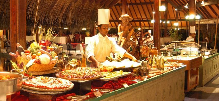 島上主餐廳,有一個(gè)門是可以直通往北面的沙灘和碼頭。主餐廳可以容納200-300人,三餐都是自助餐,菜品基本一樣。主餐廳的位置就在接待處后面。在主餐廳旁有一個(gè)半圓形的羅馬式劇場,可以舉辦晚會、表演等。