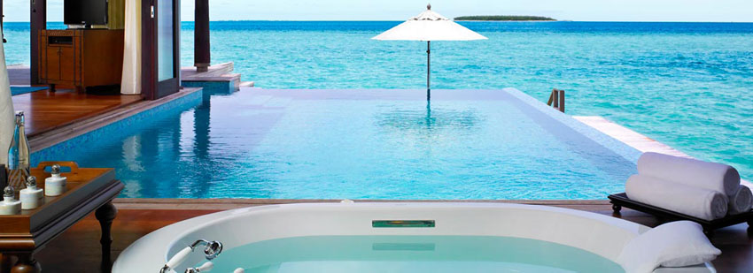 2晚沙灘泳池別墅Beach Pool Villa+2晚水上泳池別墅Over Water Pool Villa ¥15950 含早餐、水飛