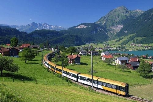 15:00 乘坐可以欣賞瑞士山水景致的【金色山口景觀列車*】,游客可以盡情眺望海拔4000米以上的伯爾尼高地的阿爾卑斯群山,一邊沿湖岸行駛,一邊眺望窗外典型的瑞士田園風光。
