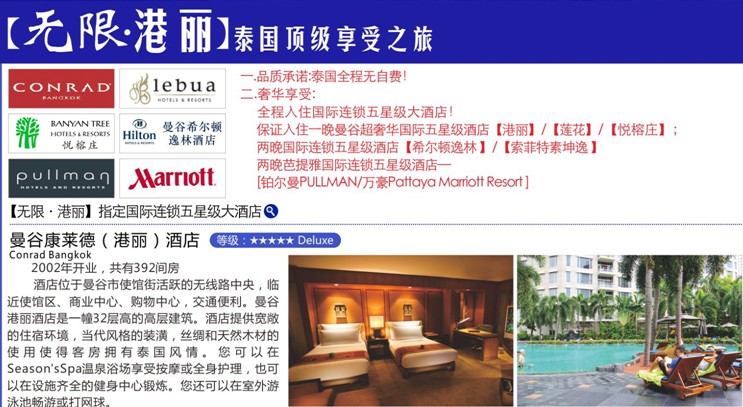 甄選泰航直飛曼谷,全程無自費(fèi),入住1晚超奢華曼谷【港麗/悅榕莊/蓮花】+2晚芭堤雅國際5星【鉑爾曼PULLMAN/萬豪】+3晚曼谷國際5星【希爾頓逸林/索菲特素坤逸】,搭乘五星泰航或國航直飛曼谷